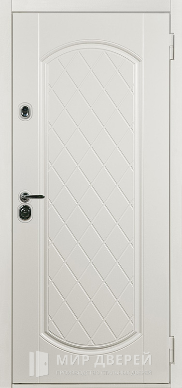 Эта белая железная входная дверь, облицованная плитами МДФ с обеих сторон, сочетает в себе устойчивость к физическому воздействию и современный внешний вид. Дверь изготовлена на основе профильной трубы 50х25 мм, что придает ей необходимую прочность и надежность. Полотно двери усилено металлическим листом толщиной 2 мм и дополнительно стабилизировано профильными трубами 40х25 мм, обеспечивая высокую жесткость конструкции.