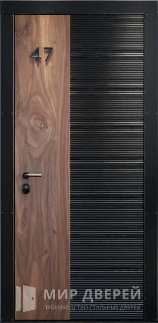 Эта модель создана для тех, кто хочет подчеркнуть индивидуальность входной зоны, сохранив при этом высокие показатели надежности. Каркас и полотно выполнены из профильной трубы 50х25 мм с ребрами жесткости 40х25 мм, а прочный стальной лист толщиной 2 мм гарантирует устойчивость к механическим нагрузкам и долговечность. Внешняя и внутренняя отделка выполнены из МДФ-накладок, которые гармонично сочетаются с темным цветом, а декоративный молдинг добавляет изысканности и подчеркивает оригинальность. Уличная дверь с необычным дизайном №26 может быть изготовлена в любых размерах, обеспечивая точное соответствие проему и требованиям заказчика. Два контура резинового уплотнителя надежно защищают помещение от сквозняков и влаги, по желанию можно добавить шумо- или теплоизоляцию. Такая дверь органично вписывается в архитектуру дома, коттеджа, офиса или квартиры, подходит для установки в новостройках и как антивандальное решение. Ее универсальность, прочность и выразительный дизайн делают эту модель оптимальным выбором для тех, кто ценит стиль и долговечность.