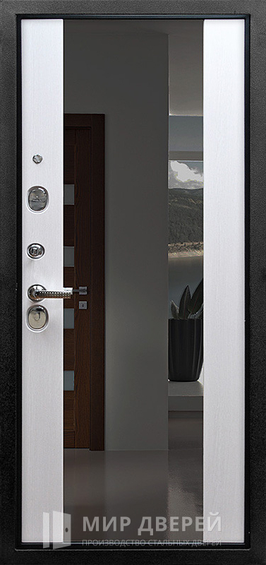 Эта модель сочетает в себе надежность конструкции и практичность современного исполнения. Каркас и полотно изготовлены из профильной трубы 50х25 мм, дополнены ребрами жесткости 40х25 мм и металлическим листом толщиной 2 мм, что обеспечивает прочность и долговечность. Снаружи поверхность покрыта молотковым напылением, устойчивым к повреждениям и сохраняющим аккуратный вид, внутри использованы панели МДФ ПВХ в светлых или темных оттенках. Зеркало во внутренней отделке делает дверь удобной и визуально увеличивает пространство прихожей. Стоит отметить, что входная дверь в квартиру от ПИК №25 оснащена двумя замками российского производства: верхним сувальдным Просам и нижним цилиндровым Мосрентген, каждый из которых имеет класс защиты 2. Конструкция предусматривает два контура резинового уплотнителя и возможность установки дополнительной шумо- и теплоизоляции для максимального комфорта. По желанию клиента дверь можно оснастить умными электронными замками, стеклопакетом, коваными элементами или видеодомофоном, а также изготовить наличники и доборы в цвет отделки.