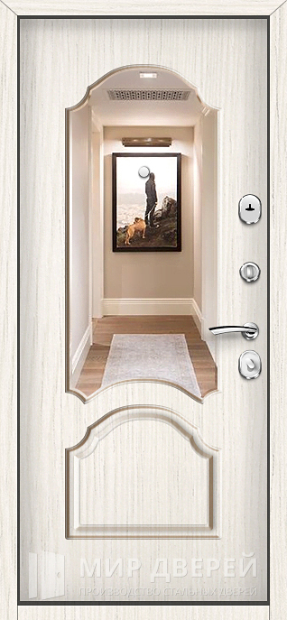 Эта дверь сочетает прочность металлической конструкции и современный внешний вид, что делает её удобной как для городских квартир, так и для частных домов или офисов. Снаружи поверхность покрыта порошковой окраской, устойчивой к царапинам и перепадам температур, а внутри установлены панели МДФ с ПВХ покрытием в светлом оттенке беленого дуба, создающем атмосферу уюта и визуально расширяющем пространство. Дополнительное удобство обеспечивает зеркало, встроенное во внутреннюю часть полотна, что особенно актуально для квартир в новостройках. Именно поэтому входная дверь в квартиру ПИК №57 гармонично сочетает надежность, функциональность и стиль. Конструкция выполнена из профильных труб с ребрами жесткости и усилена стальным листом толщиной 2 мм, обеспечивающим долговечность и устойчивость к взлому. Для безопасности предусмотрены два замка российских производителей — сувальдный Просам и цилиндровый Мосрентген, каждый со своим классом защиты и ригельной системой. Два контура резинового уплотнителя защищают от сквозняков, а при необходимости дверь можно дополнить шумо- и теплоизоляцией или украсить декоративными элементами.
