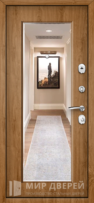 Эта модель сочетает надежность металлической конструкции и элегантность деревянных панелей, что делает её универсальным решением для установки в квартиру, офис или частный дом. Каркас изготовлен из профильной трубы 50х25 мм, полотно усилено ребрами жесткости 40х25 мм и листом стали толщиной 2 мм, что обеспечивает прочность и долговечность. С внешней и внутренней стороны дверь облицована панелями МДФ ПВХ в оттенке дуба, создающими гармоничный и стильный вид, который будет уместен в любом интерьере. Дополнительный функционал придает встроенное зеркало, визуально увеличивающее пространство и добавляющее практичности. Именно поэтому дверь входная в квартиру Легран №9 представляет собой не только средство защиты, но и элемент комфорта. Для лучшей герметичности установлены два контура резинового уплотнителя, защищающих от пыли и сквозняков, при желании можно усилить конструкцию плитами минваты или пенопласта для повышения шумо- и теплоизоляции. Надежность конструкции дополняют два замка: сувальдный Просам и цилиндровый Мосрентген, обеспечивающие базовый уровень безопасности с возможностью замены на более современные модели или электронные системы. Дверь можно дополнить доборами и наличниками в цвет отделки, а также оснастить видеодомофоном или декоративными элементами.
