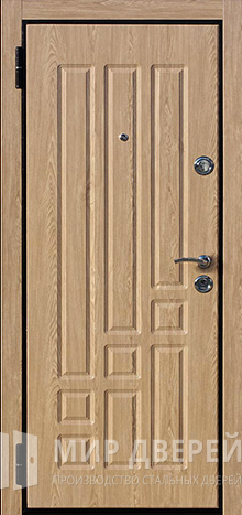 Эта входная дверь, сочетающая в себе ламинированные панели с внешней стороны и плиту МДФ с внутренней, идеально подходит для квартир и офисов, благодаря своему современному дизайну без декоративных элементов. Структура двери включает прочный металлический каркас из профильной трубы и лист металла толщиной 2 мм, обеспечивая надежность и долговечность. Ребра жесткости усиливают конструкцию, а система блокираторов повышает безопасность.