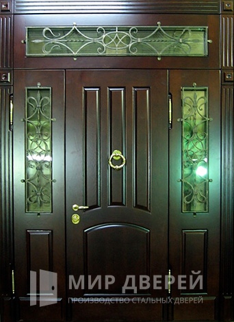 Дверь выполнена из массива дуба, что обеспечивает ей не только визуальное великолепие, но и высокую прочность. Массив дуба известен своей долговечностью и устойчивостью к внешним воздействиям, что делает его идеальным выбором для изготовления дверей. Внешний вид двери украшен элементами ковки, которые придают ей изысканный и респектабельный вид, а вставки из стекла позволяют проникать естественному свету в помещение, создавая тёплую и приглашающую атмосферу.